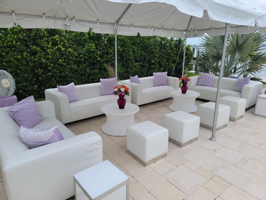 We offer many beautiful combinations of Lounge Furniture and LED Furniture that will compliment your party. This Lounge and LED set shown here, seats between 15 to 20 guests and it includes 18 pieces of furniture and 8 throw pillows. All of our Lounge furniture is modular and can be configured into a variety of combinations creating an ambiance of style and elegance.
