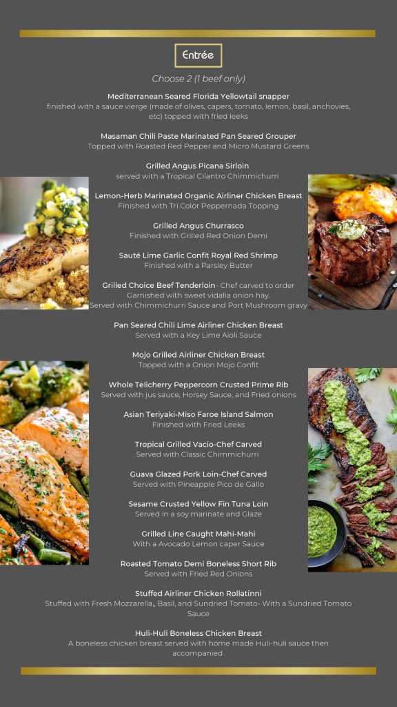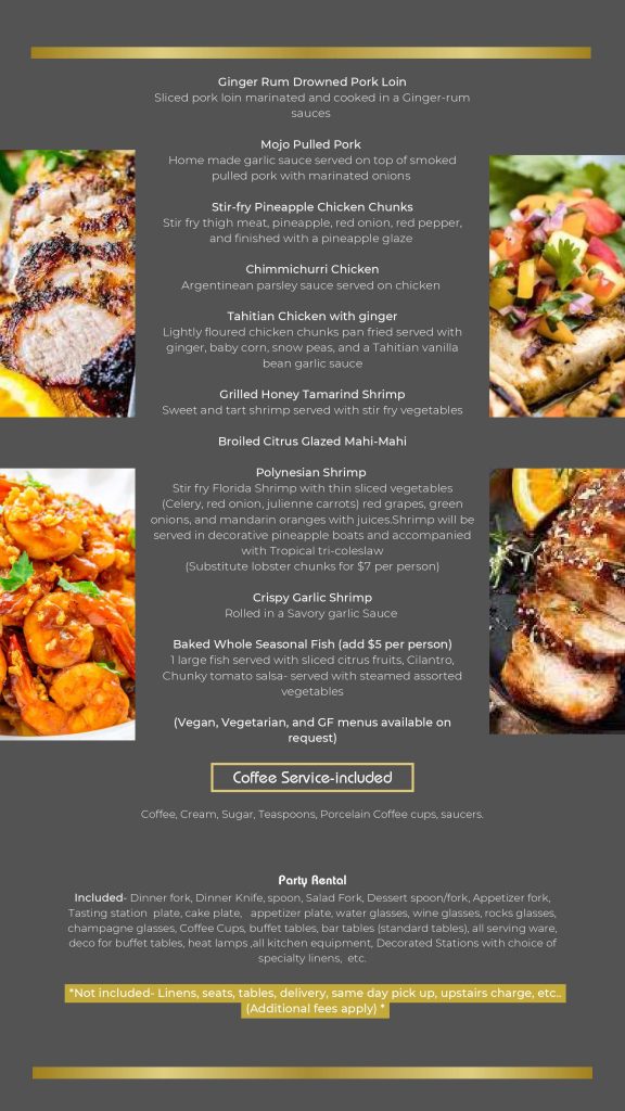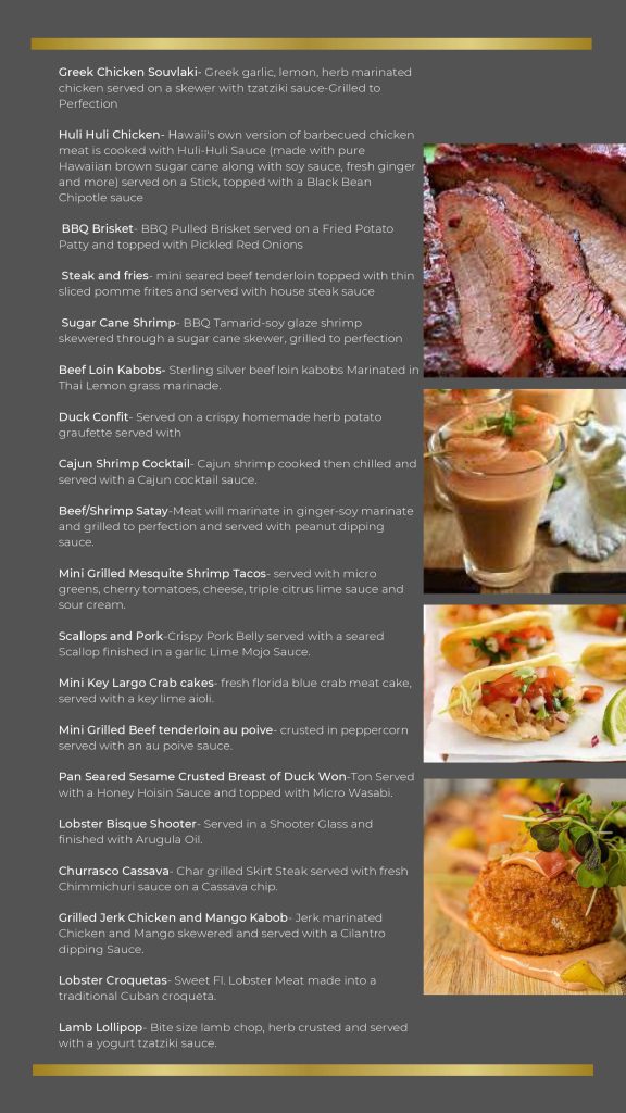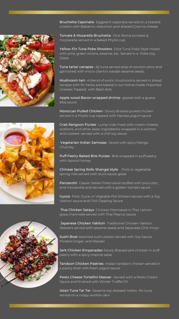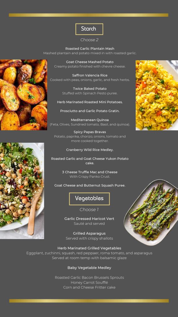 - Gourmet – Our Gourmet Catering is designed for weddings, corporate events, galas, and upscale celebrations. Featuring chef-crafted dishes, elegant presentation, and high-quality ingredients, this premium menu offers a refined dining experience that elevates any event. Perfect for clients who want luxury, sophistication, and unforgettable flavor.